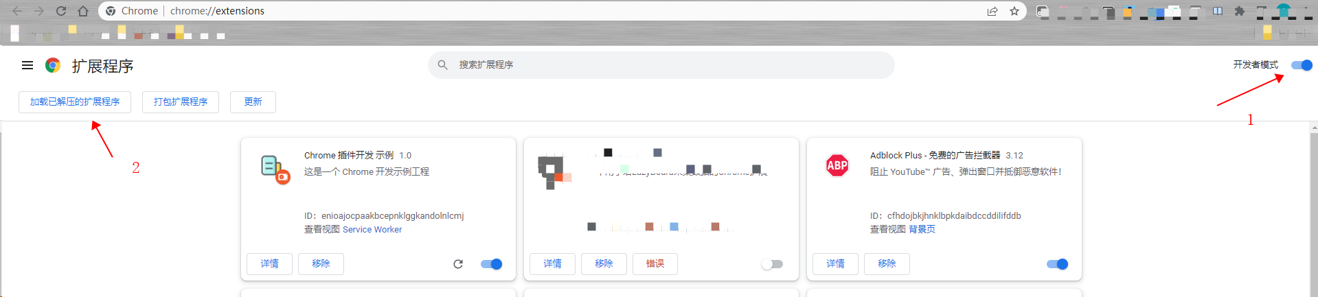 然后就可以尝试一下插件的运行啦,进入插件页面,先在右上角开启开发者模式,然后点击加载已解压的扩展程序,找到你的 start 文件夹加载进来。